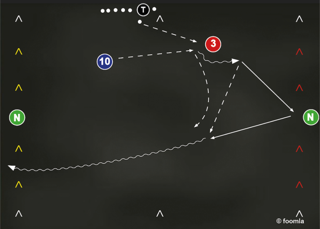 Jetzt wird ein neutraler Spieler hinzugefügt, der als Wandspieler dient. Der Angreifer kann den Ball zum Wandspieler passen, um eine bessere Position zu erlangen. Dies fördert das strategische Denken und das Passspiel unter Druck.